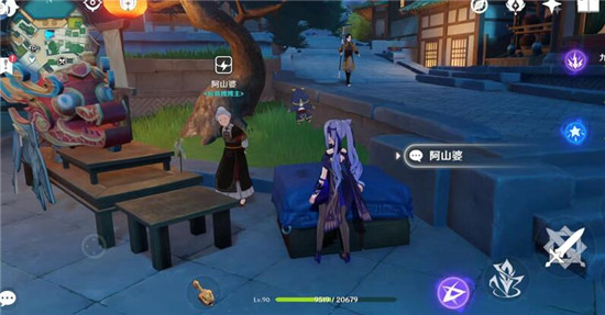 来到璃月右边的传送点,在传送的左前方找到卖玩具的阿山婆。
