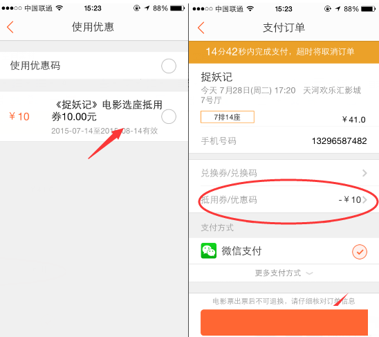 2、在选座提交订单后,大家可以看到抵用券/优惠码显示可用,点进去!