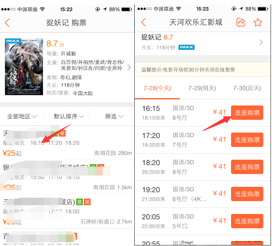 1、因为小编的抵用券仅限购买捉妖记!所以随便在哪个影厅选择捉妖记,正常步骤购票