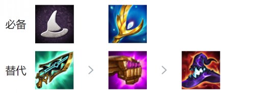 任意法强装备都可以出,"铲子"优先抢,有两个"女神之泪",就给"瑞兹"出一个"青龙刀"("瑞兹"的蓝条会越来越长)。C位有一个输出装备之后,就拿"奥恩"的肉装。