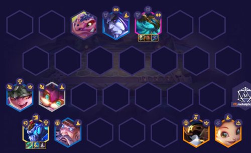 7人口,上"瑞兹"和"塞拉斯",组【5法师】(如果没有多余的“娜美”,上“弗拉基米尔”),组不出【5法师】,多上几个【重骑】。看到“盲僧”可以留,带【法转】过渡比较好用。如果嫖不到“瑞兹”,7人口小搜一下。
