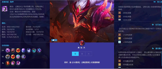 被动:【奥拉夫】寻求荣耀之死,在每次阵亡时永久获得5攻击力(【狂暴模式】中为10)。 主动:奥拉夫打击他的目标,造成120/216/388物理伤害(200%/200%/200%攻击力)并获得40%/50%/60%攻击速度,持续6秒,如果他低于50%生命值,这个攻击速度加成会翻倍。属性:生命:800/1440/2592暴击率:25/25/25