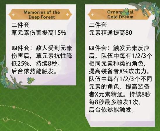 四件套:当敌人受到元素伤害时,草元素抗性减少25%,持续8秒,当造成伤害的角色在场外时也可以触发