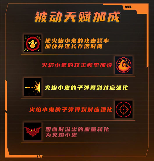 恶魔术士每击杀一名敌人,或对BOSS每造成一定伤害,就能召唤出一个火焰小鬼。召唤出的小鬼存在数量上限和存活时间。火焰小鬼会跟随玩家移动,能够投射火焰子弹,并且可以阻挡敌人的子弹。