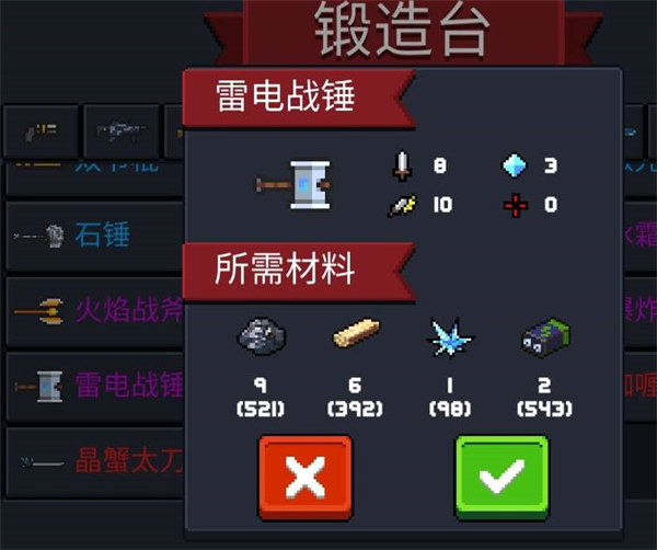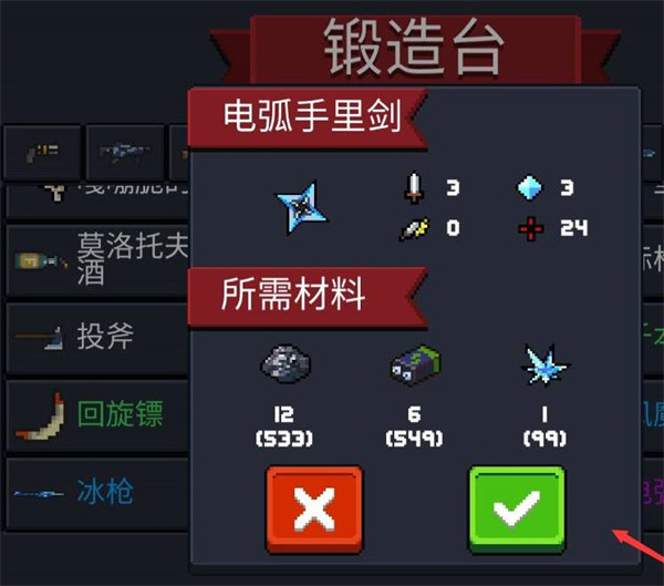 2、两件合成所需的装备都可以在右侧锻造台打造。将角色移动至右侧锻造台,选择指定装备然后点击绿色“确定”按钮即可。