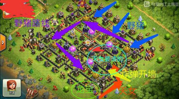 先下天女,下天使之前下个气球探黑炸,同时下龙宝开始清边,让女王走你想让她走的路,等女王吸引火力之后下炸弹,开墙,一定要等女王吸引火力之后下,不然开失败就GG了,待已方掉地方女王援兵之后就可以下野猪了,如果女王能把鸟炮清了就待女王清掉之后下野猪,然后法术自己看着下,注意清边收尾,三星还是很容易的。