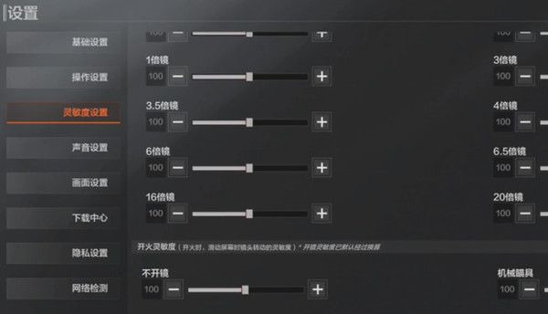 2.镜头灵敏度又分为开镜和不开镜的灵敏度两种,不开镜灵敏度只要视野滑动顺畅即可,开镜灵敏度则建议玩家实际测试后调到适合自己惯用武器惯用倍镜的习惯手感最佳。