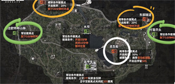 北部山区的撤离点,有2个绿色撤离点是根据队伍位置确定,黄色的是2个概率撤离点,最后五分之一还会概率开启一个白色撤离点,本身还有2个常驻撤离点。