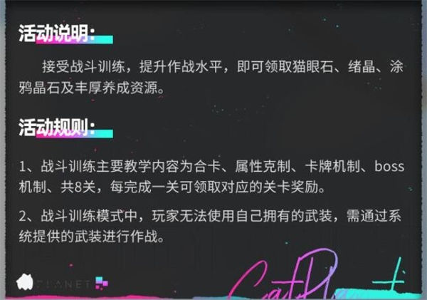 接受战斗训练,提升作战水平,即可领取猫眼石、绪晶、涂鸦晶石及丰厚养成资源。