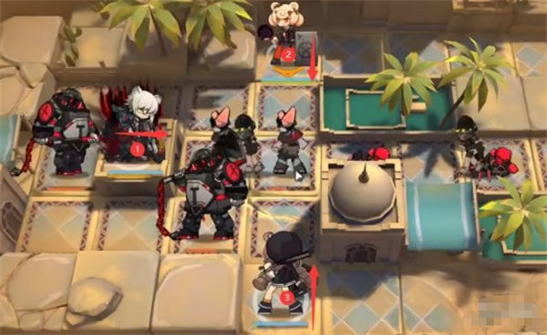 1.开局如下图位置部署奥斯塔(向右)→ 古米(向下)→ 蛇屠箱(向上)。