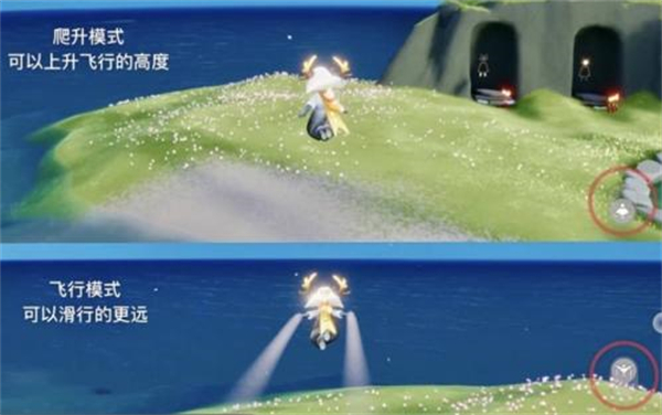4、在光遇中,是可以飞行的,飞行想要飞的更高更远也是有技巧的,如下图所示,飞起来之后会出现飞行标志,翅膀合着就是向上飞,翅膀舒展开就是向前飞。