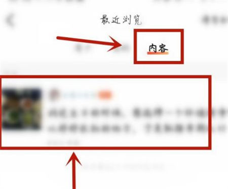 3、然后,我们在【最近浏览】页面中点击【内容】,并选择自己要查看的评论过的内容。