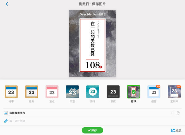 5、点击设置好的计时后,可以设定更加精美的主题并保存至相册,方便用户分享至朋友圈或其它社交平台。