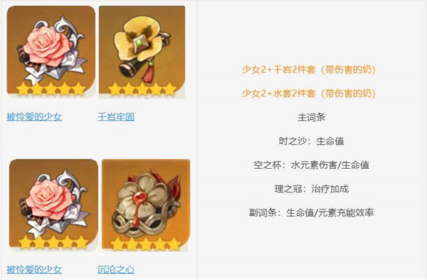 主词条时之沙生命值、空之杯水元素伤害/生命值、理之冠治疗加成。
