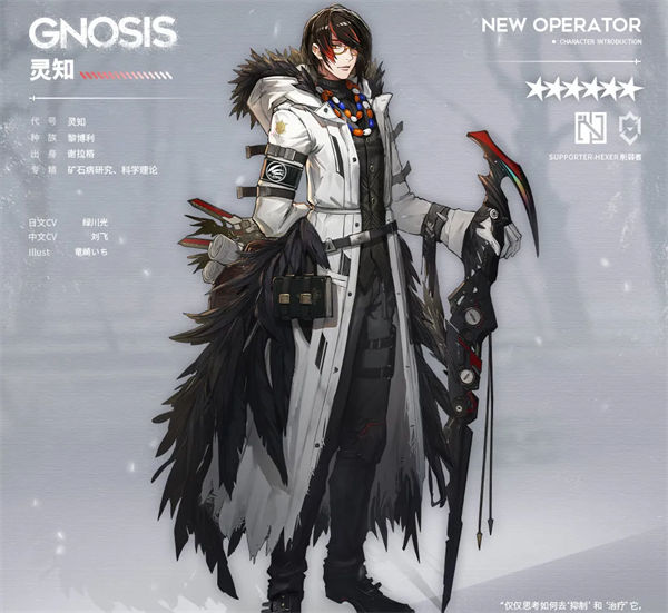 六星削弱者辅助干员,灵知。他的特性是“攻击造成法术伤害”,在辅助中代表着子职业“削弱者”。他们尤为擅长使用技能去削弱敌人各方面的能力,降低其攻击/防御/法抗等等方面属性,从而增益我方输出或是提供保护。