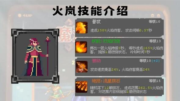火岚的技能加点肯定是优先把绝招给拉满,必须把火岚的大招伤害拉满,接着可以再去拉满火岚的技能,其次就是再去拉火岚的被动,普攻我们可以留在最后拉,普攻这里稍微拉个5点就行了,绝招和技能拉满后能把被动拉满也尽量拉满,因为能提升大量的火焰伤害,这样也能使火岚的绝招火焰伤害和技能火焰伤害更高!
