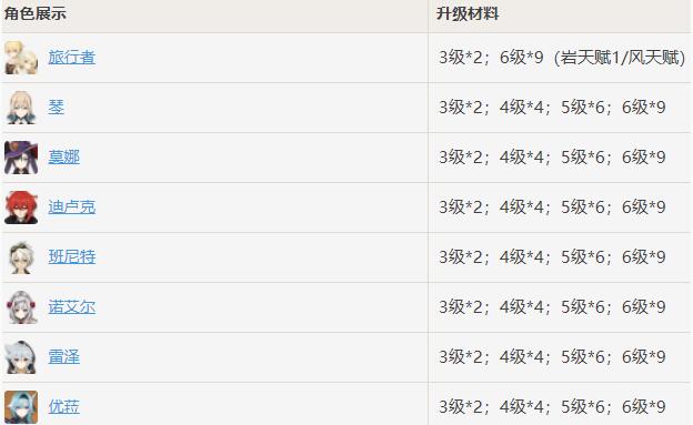 旅行者(风)、琴、莫娜、迪卢克、班尼特、诺艾尔、雷泽、优菈