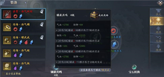 宝石镶嵌最需要注意的技巧,就是激活宝石的镶嵌共鸣属性。如图所示,当玩家身上的宝石达到共鸣要求时,能够激活镶嵌共鸣,给玩家带来大幅度的属性加成。因此不要盯着一颗宝石强化,结合自己的装备实力进行提升即可。