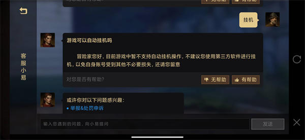3、最后玩家进入客服小易界面,输入挂机,接着客服回答目前游戏中暂不支持自动挂机操作,不建议您使用第三方软件进行挂机,以免自身账号受到其他不必要损失。