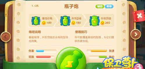 但是满级的它有为周围炮塔加攻击素的的作用,糖果赛后期满图的炮塔,没有多余的空间种其他炮塔了,瓶子炮在密集的炮塔里增加攻速的作用就体现出来了,增加了10%的攻速,相当于多了10%的炮塔。所以尽可能的让瓶子炮覆盖大量的炮塔,但是不要种太多瓶子炮,毕竟本身的攻击摆在那,2~3个就可以了。