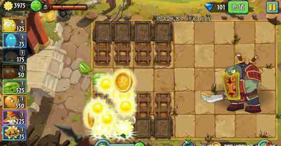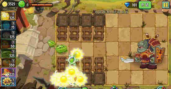 第一步,轨道车上种上两颗原始向日葵,在关卡能量豆处放置300阳光左右的植物,如西瓜投手。(注:是两颗向日葵,种一颗喂能量豆太慢,种三或四棵时间太长)