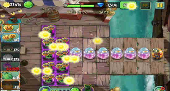 第二步,安置好植物后,第一时间给两颗向日葵喂能量豆,此时刚好可以收集赠送的能量豆,收集完再次分别喂能量豆,收集好金币,四颗能量豆总金币2000。