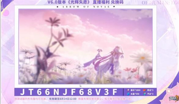 1、崩坏三6.0前瞻直播兑换码是JT66NJF68V3F