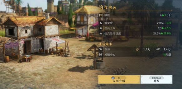 作为整个领地最重要的核心建筑,城镇中心中心的等级是其他所有建筑的上限。并且随着它的升级,我们还能开启更多的功能建筑,占领更多资源领地。包括至关重要的时代升级,也需要在城镇达到一定等级才能提升。