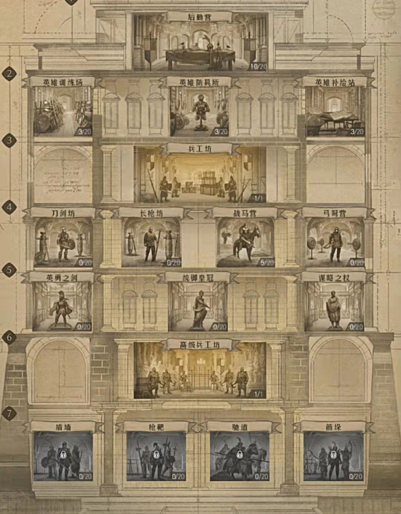 士兵是开疆扩土的核心基础,兵营的提升能加快士兵的训练数量、训练速度。配合时代,兵营在达到5、10、15三个等级时,还会产生质变。