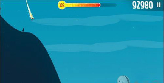 游戏屏幕上方还有奖励的状态,上面会显示滑行中收集的金币数、完成高难度动作数,填满状态后就可激活火箭船等各种高级工具。
