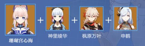推荐理由:常规永冻队,这套阵容中心海主要提供挂水与治疗;绫华作为队伍的主要输出使用,申鹤为绫华提供增伤,双冰共鸣提高暴击率;万叶提供聚怪与增伤。