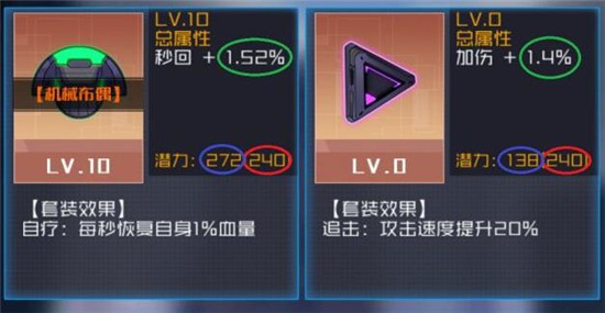 蓝圈中的数字表示芯片的潜力值,绿圈中的数字表示芯片的具体属性,这两者随着每次强化的点击而同步提升。