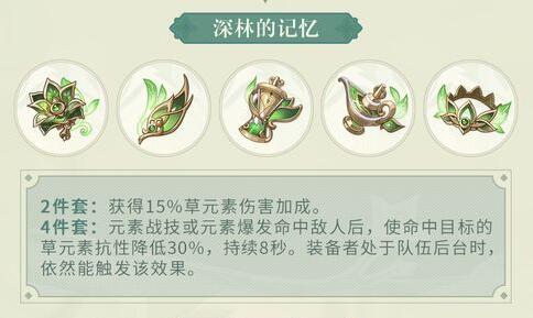 这是须弥版本新出的圣遗物,也是目前最适合草系角色的圣遗物搭配。2件套可以带来15%的草元素伤害加成,4件套则是降低目标的草元素抗性,都能够大大提升提纳里的输出伤害,如果你想要让提纳里当主c的话,那么这套深林的记忆四件套就非常适合