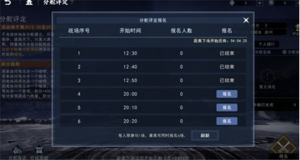 分舵评定简单来说就是在活动开启后加入房间,在规定时间内通过击杀敌人获取大量积分,达到积分要求就可以获得奖励,在可进行作战的时段内共开启6场评定,每10分钟开启1场,玩家需要提前报名才能参与作战,且每个玩家仅可参与一场