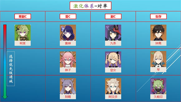 目前柯莱的主要配队主打草雷激化体系,至于草水绽放体系和草火燃烧体系,还有待开发。目前来说,比较常见的草雷激化体系阵容都是草系副c+雷系主c,草系角色都是走副输出定位。当然,你如果抽到提纳里的话,也可以走双草路线,以提纳里为主c,柯莱和一名雷系角色走副c,阵容主要以草伤为主。
