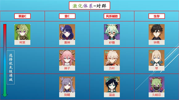 思路:以雷输出为核心,草为副输出,编入风系聚怪辅助,补足对群短板。