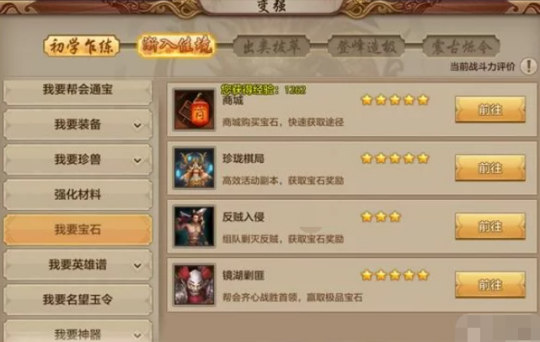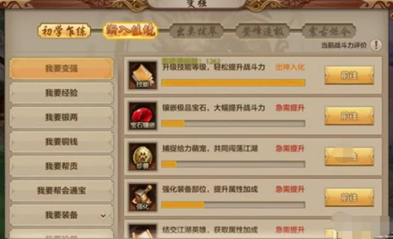 首先点击屏幕左上角的要变强图标,可以清晰的看到自己哪一方面不足,以图片账号为例,很明显的就是在同等级中,宝石,宝宝装备强化等方面严重不足。那么大侠可以大致看看这个来判断自己需要从哪一方面加强,切莫随心随性的一通骚操作结果发现自己战斗力并没有多少提升。