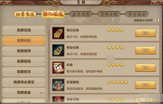 该如何快速地获得更多经验以提升等级来提升战斗力呢?小弟认为,等级提升并不是最佳的方法,因为等级提升快了,那么该等级应有的战斗力水平也会相应的提高,基本上很难做到同步,所以并不是很推荐,以提升等级来提升战斗力。当然有时候等级可以带来新的装备新的系统比如暗器系统,这又另当别论了。那么具体的提升等级方法如下,每日任务是必刷的不需要什么时间,基本上是挂机嗑瓜子,帮会任务与每日任务类似。科举每天一顶要参加,经验丰富而且不太难,涉及本游戏的知识和天文地理,古诗词。帮会行酒令与科举答题类似。珍珑棋局一定要参加,经验真的超级多,拿经验到手软的地步。夺马宝贼什么的是一键必刷项目,帮会练功就很哲学了,大家都懂的,经验来的很随性,经验最多的就是3000怪了,日常3000怪还是要一定的时间的,所以各位大侠一定要准备好,给手机充电!
