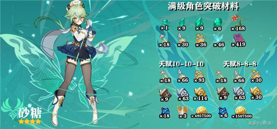 砂糖是一位四星风系精通辅助,同时具备聚怪、增伤等功能。砂糖的角色突破属性是风元素伤害加成,80级突破后共可额外获得24%风元素伤害加成。
