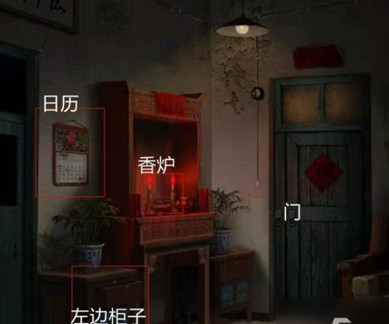 第23步:在桌子上的【右侧盒子】处,如下图输入密码,开启后可以拿到“指甲刀”,使用“指甲刀”剪开五路财神像桌子处的插座胶带,拾取“插座”;