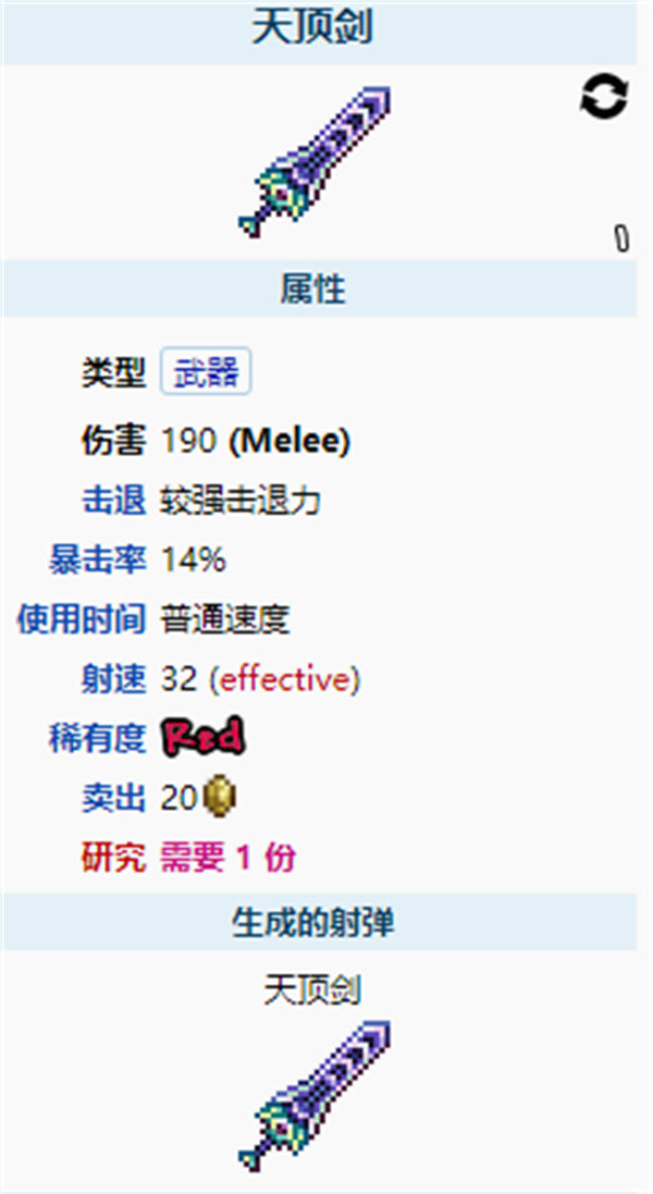 天顶剑 是一把困难模式,月亮领主后的剑。它能自动挥舞,射弹可以穿过物块。它需要使用玩家在整个游戏过程中的不同阶段获得的各种剑在困难模式的砧制作。