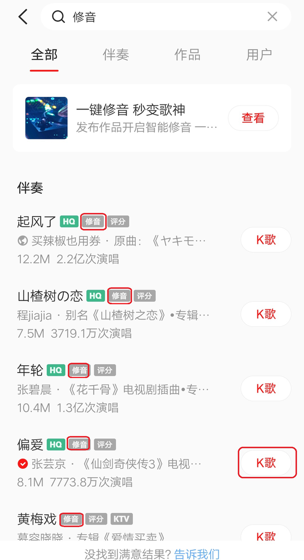 接着列表中的歌曲就会带有【修音】的字样了,选择一首歌曲进行【K歌】。
