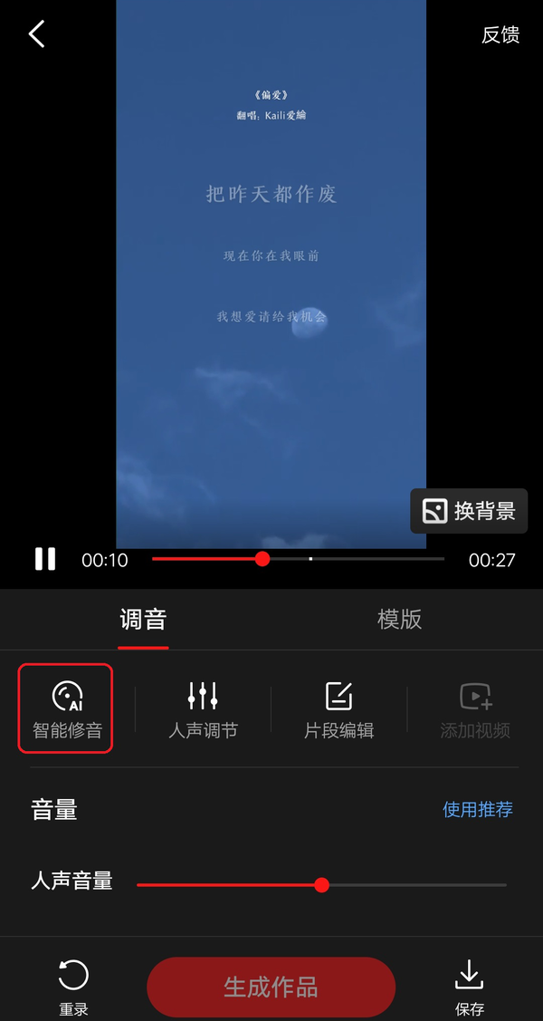 歌曲在演唱结束后的界面中,我们便可以在这个界面中,看到【调音】选项下的【智能修音】功能了。