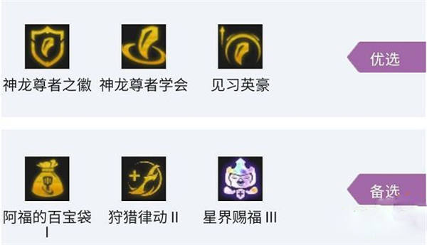 海克斯优先选择神龙尊者之徽、神龙尊者学会、见习英豪,备选阿福的百宝袋I、狩猎律动II、星界赐福III。