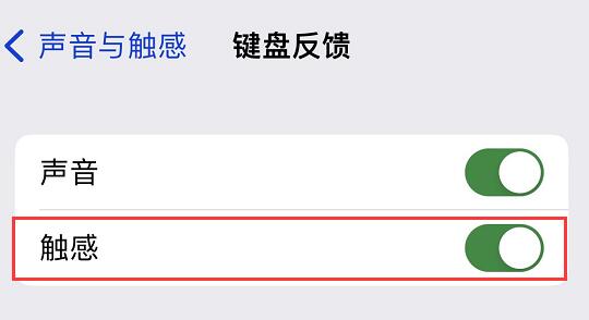 3、在“键盘反馈”界面中,将“触感”功能开启,这样你以后使用自带键盘打字便会有震感,不过无法调节震动强度。