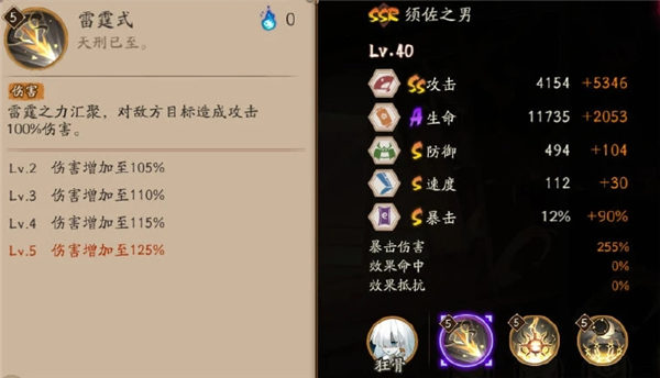 天威:回合释放技能前释放,消耗一把天羽羽斩,211%(满级231%)伤害,不超过该友方目标初始攻击的400%。满级无视御魂,释放天威的时候,须佐获得持续2回合,攻击49%的雷盾,最多叠2层。雷盾无法被驱散。
