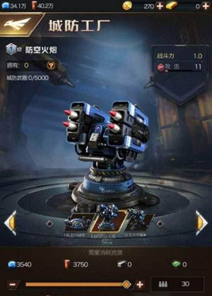 在城防工厂里建造碉堡、防空火炮等都可以增加城防武器战斗力,越高级的城防工厂能制造越高级的城防部队。