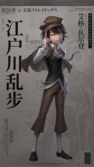 第五人格是一款有着哥特式风格的解谜游戏,游戏有着真实的物理引擎,能够自由的控制角色移动,还采用了3D的游戏视角,能够随意调节方向,更是有着紧张刺激的追逃玩法,需要在一定时间内打开安全门逃生。第五人格中每一个角色都有着自己的技能以及天赋,玩家分为两个阵营,在庞大的庄园地图中进行激烈的对抗,游戏音效十分的阴森,让玩家能够沉浸在恐怖的氛围之中。第五人格与文豪野犬联动的皮肤消息已经来啦,接下来为大家介绍一下第五人格画家江户川乱步皮肤一览。