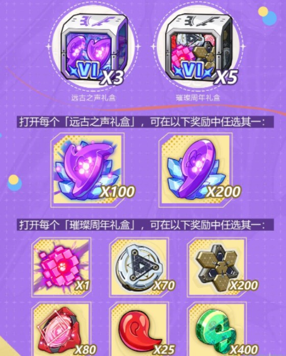 3、周年庆盲盒,玩家只要参与活动就可以获取远古之声盲盒以及璀璨周年庆礼盒,打开可以获得超多物资奖励。