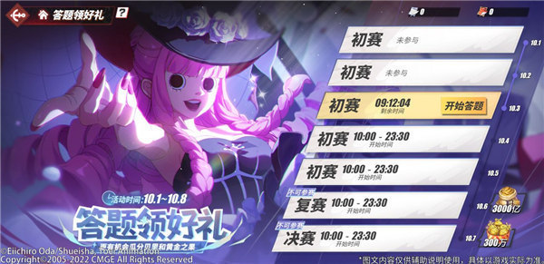-本次活动一共分为三个阶段:初赛、复赛和决赛。初赛每日可以参与一次,10道题中答对超过6道题即可获得复赛资格;复赛每日可免费参加一次,消耗黄金之果可额外参与一次,15道题中答对超过10道题即可获得决赛资格,获得复赛和决赛参与资格的船长需要在指定日期参与对应比赛。